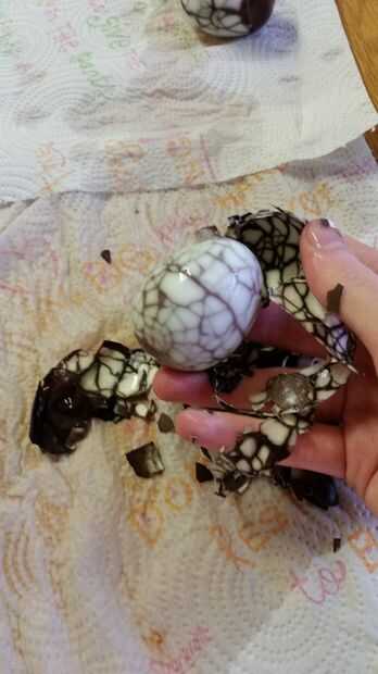 Esta parte depende de usted. Cuanto más tiempo los huevos marinar en la mezcla de vino, el más intenso su sabor. Dejé en alrededor de dos horas porque estaba corto de tiempo. Si tienes tiempo en remojo durante la noche (en el refrigerador), adelante. Mina tenía un sabor notable, pero no es la intensidad que deseaba.