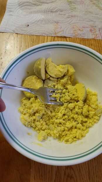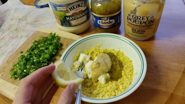 Se desmenuzan las yemas con un tenedor y añadir aproximadamente la mitad de un chile jalapeño finamente picado, el mayo, el gris poupon, la salsa y un toque de limón. Mezclar bien y ajustar cualquiera de los ingredientes al gusto. ¿Además, puede Agregar sal y pimienta o tal vez más jalapeños?