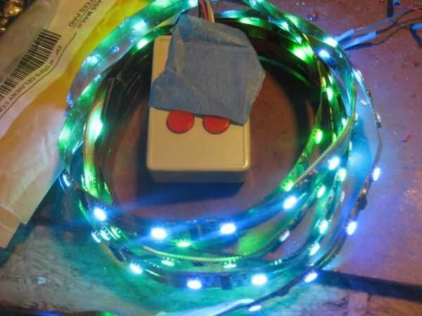 La construcción es simple que tiene el ingrediente secreto que es una longitud de tira de luz RGB basada en el controlador LED HL1606 Corp de Asic de Wuxi en China. Yo tengo la mía en un viaje de negocios en Shanghai. Estas tiras de la luz se están volviendo populares para señalización e iluminación arquitectónica alrededor del mundo. He adjuntado una imagen de la cadena de 5 metros que compré junto con la caja del regulador. Si bien no son comunes en este país (por ahora), hay varios proveedores en el Oriente que le enviará parte de esta magia cosas. Compruebe hacia fuera estos proveedores. Proveedor 1 , proveedor 2. Habrá muchos más pronto, sin duda! (Nota: ver este espacio... Creo que puedo comprar algunas de estas rayas de China pronto. Estaría encantado de conseguir algo para la gente si hay interés)