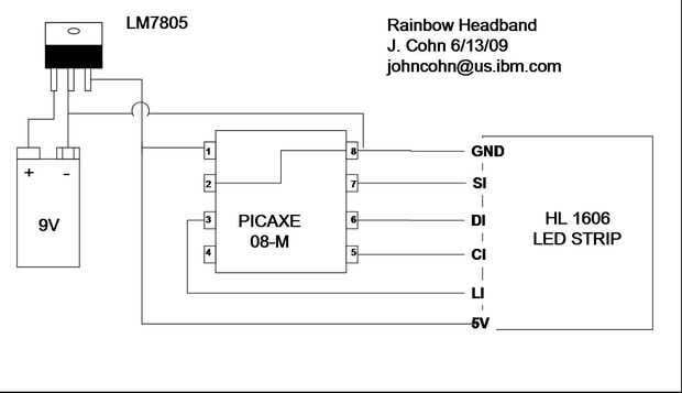 Una vez calculé hacia fuera, fue bastante sencillo programar un micro controlador para conducir las tiras. Usé un PICAXE 08 M . Elegí el PICAXE porque una) que tenían puesta alrededor :-) y b) que requieren muy pocos componentes externos para utilizar.