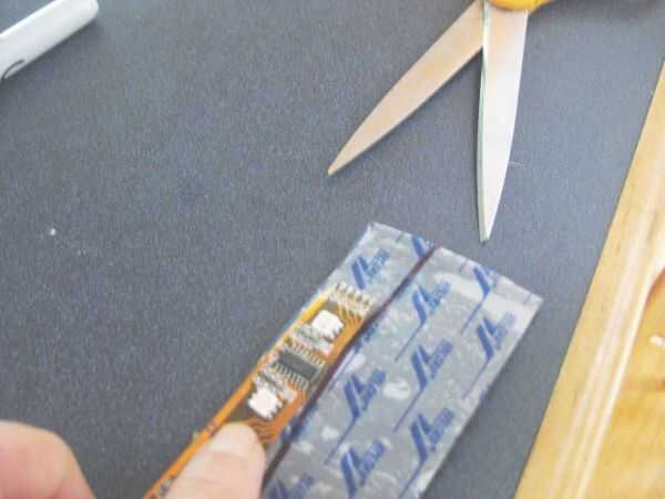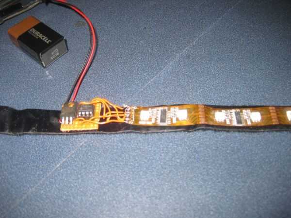 -Deje las últimas 6 pulgadas o menos de respaldo intacto en la tira. Utilice cinta aislante para proteger el cableado entre la Junta de perf y la tira de la luz. También poner una tira de cinta aislante alrededor del conector de batería para darle algunos releif de estrés