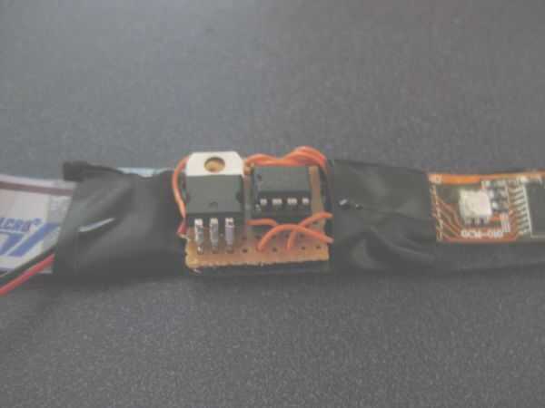 -Cortar dos piezas más cortas de velcro 'espinoso' y utilizarlos para crear un bucle para sujetar la batería hacia abajo. Hacer esto conectando el extremo de la pieza 'espinoso' velcro 'suave' en el interior de la diadema, lazo firmemente sobre y alrededor de la batería, luego conecte el otro extremo del lazo 'espinoso' al velcro 'suave' en el interior de la banda. Puede parecer complicado... pero no lo es). Use la otra tira 'Espinosa' para hacer una cubierta simple para la Junta de perf. Esto le impedirá perder su procesador PICAXE cuando tu baile hacia afuera.