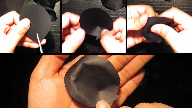 Tercer pétalos de la capa. Corte 1 ranura en el extremo puntiagudo de la lágrima. Otra vez, doblar y pegar en su lugar. Utilice el pulgar para el borde de atrás de la curva.