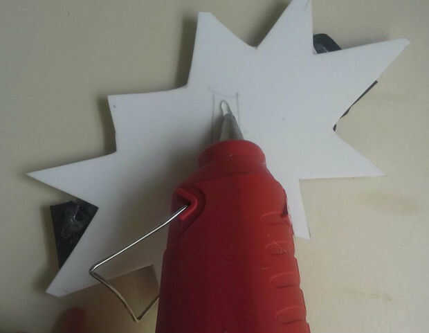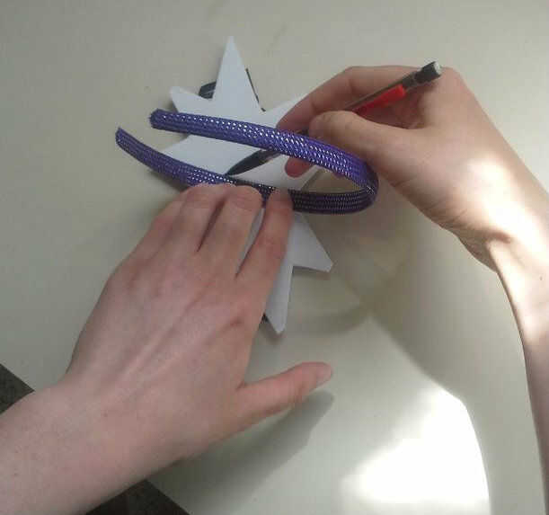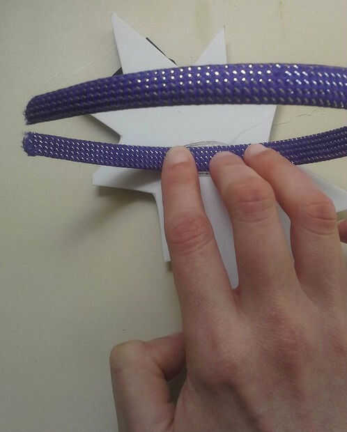 Una vez que el pegamento se haya secado, tomar una cinta para la cabeza y marcar donde quieres que el efecto de sonido en la parte posterior de la espuma. Aplique pegamento caliente entre las líneas que ha marcado. La banda de la cabeza sobre el pegamento caliente oprimida hasta que se enfríe (cuidado de no quemarse los dedos).