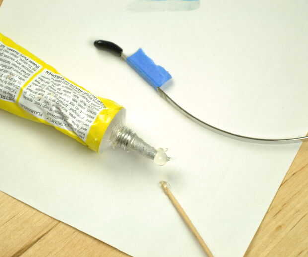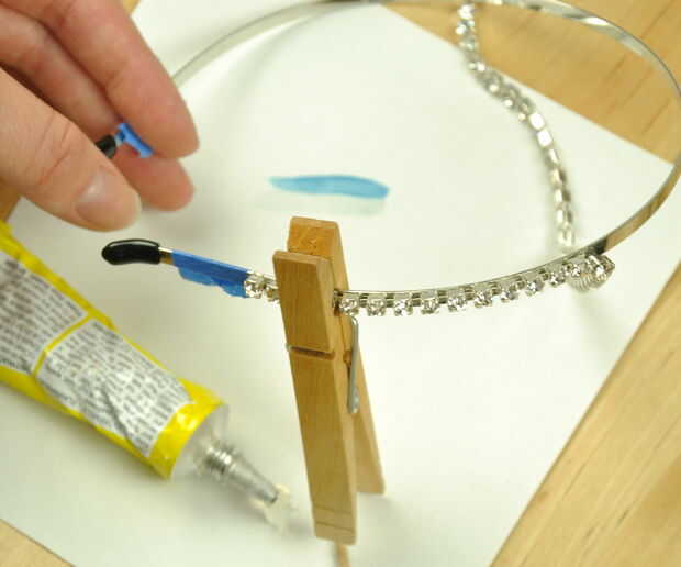 Esto es lo que hice. Tomé el pegamento, un trozo de papel y un palillo de dientes. Poner pegamento en el papel y utilice el palillo de dientes para dab derecha un poco arriba del grifo. Pegar en el rhinestone del final. Agárrate fuerte con una pinza para la ropa. Ahora agregue el pegamento más y más (no van para necesitar una tonelada, así que no pegote, solo difundirlo en), pegar la cadena en marcha. Ir hasta el final.