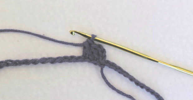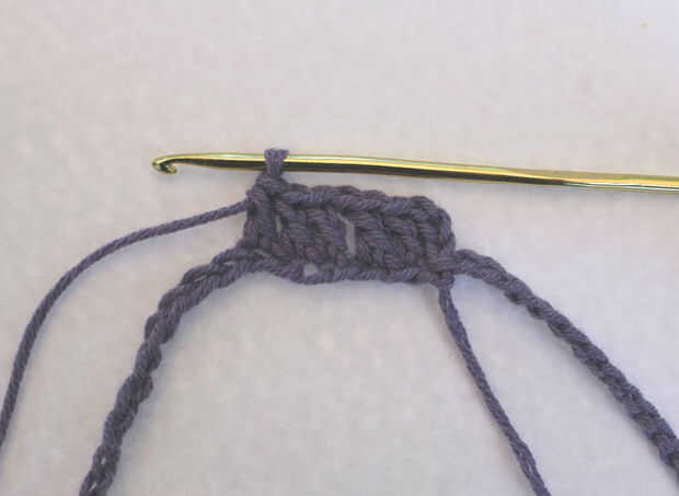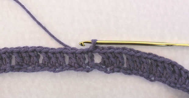 Cadena tres, doble crochet en dos puntos. Repeat {cadena uno, saltar un punto, del ganchillo doble en los próximos tres}, dentro de los paréntesis alrededor de todo el camino. Fije apagado púrpura y fije el Color B (el mío es blanco).