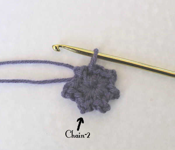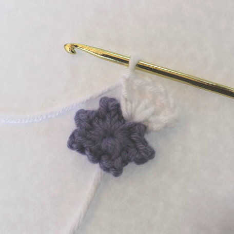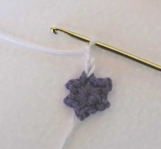2. en el anillo del ganchillo (crochets solo dos, cadena dos). Repetir dentro de los paréntesis para un total de seis veces. Puntada de resbalón al principio. Ajuste de blanco y fije la púrpura (o Color).