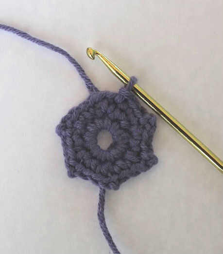 2. {solo crochet en dos puntadas, cadena dos}, repetir dentro de los soportes para un total de seis veces. Slst al principio.