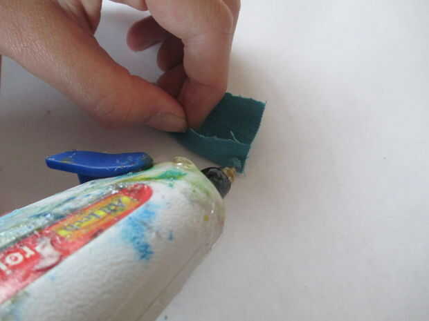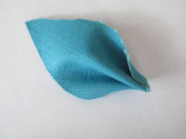 Añadir gotas de pegamento caliente y doblarlas en la parte inferior del pétalo para formar un punto. Hacer esto con 5 piezas de tela para hacer 5 pétalos.