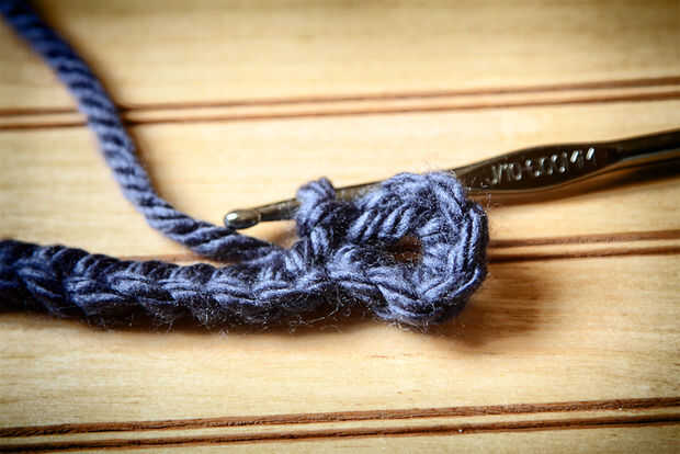 Ahora que tiene su cadena de hacer cuenta atrás 8 y slip punto en esa cadena. (ver foto 3) Si no sabes cómo hacer una puntada de resbalón puede ver una ilustración de cómo hacer uno aquí: Puntada de resbalón , ahora vas a tener un lazo. Esto va a ser el agujero para el botón.