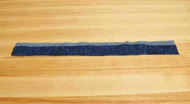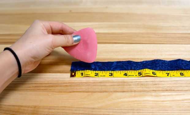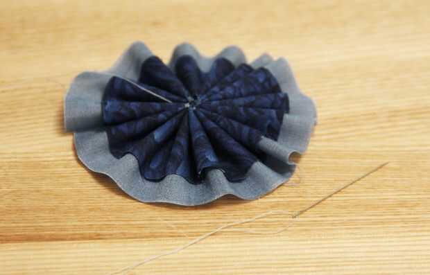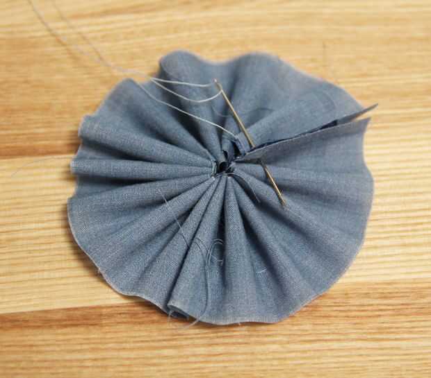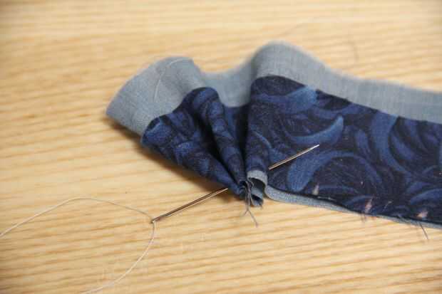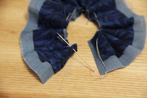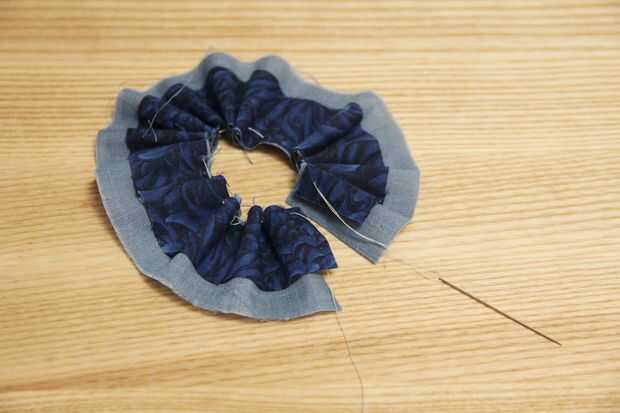Crear puntos de media pulgada tirando de la aguja a través de las marcas de media pulgada realizadas. Estire la aguja a través de la tela para que la tela se arrugar_. Coser juntos los extremos de la tira de 12". Asegúrese de que el resto de la tela es todavía agrupado para arriba mientras que haces esto.