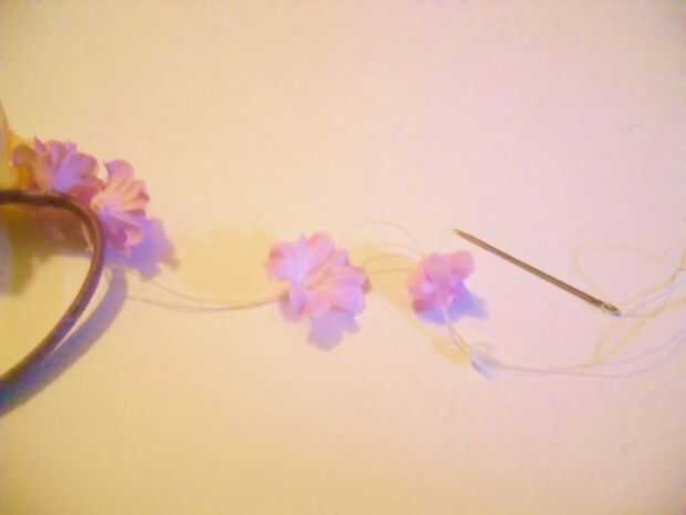 Hilo que la aguja a través de la banda y la flor, a veces capas las flores (como se muestra) puede crear un efecto genial. Fijar la flor a la diadema.