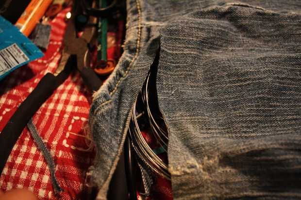 En mi empeño de joyería encontré un gran brazalete nuevo y sencillo diseño.Paso 1: fuentes deAquí es lo que necesitaba a utilizado para hacer mi pulsera de jeanPantalones vaqueros viejosAlambre de metalTijerasPaso 2: Corte Jean Empecé por cortar la c
