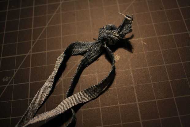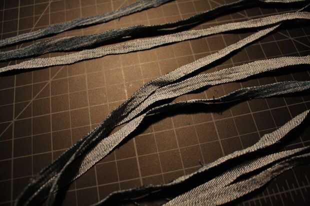 4. corte nueve tiras rectangulares de tela, aproximadamente 2 pies de largo (dependiendo del tamaño de la cabeza) y 1/8 pulgada de ancho (corte verticalmente a lo largo de la tela de la pierna de pantalón).