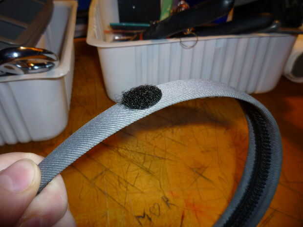 Tomar una de las vendas y uno de los «suaves» redondos de Velcro (la parte del lazo, no la parte del gancho) y pegarlo en la diadema. Siente libre de ponerse la venda y hacer esto en un espejo para llegar a un ángulo de lindo. (Si planea hacer "orejas de gatito" más adelante, tendrás 2 de estos en la diadema en los ángulos apropiados).