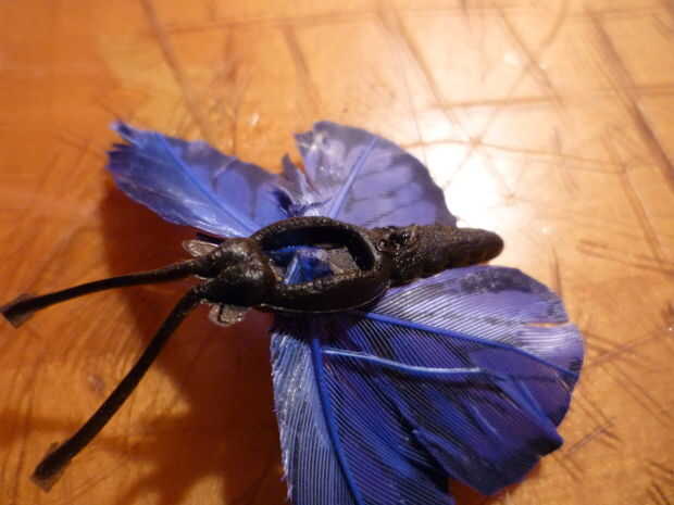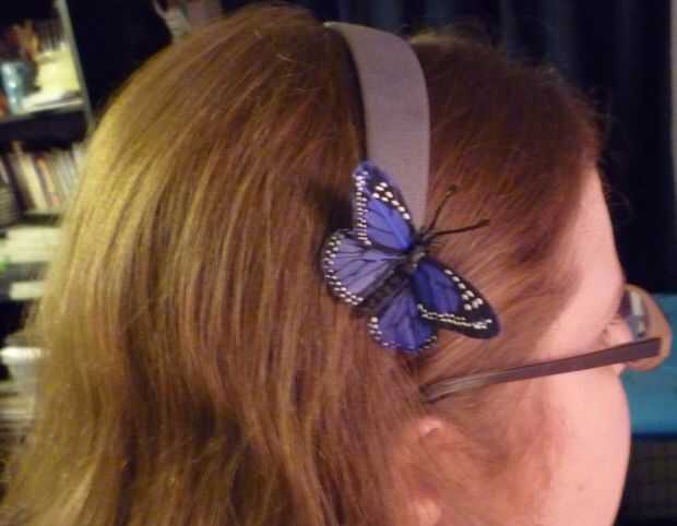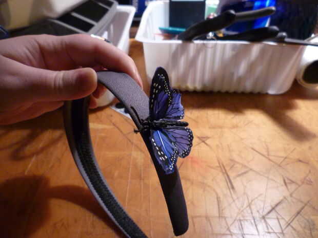 Mariposas de plumas: Estos pueden encontrarse en tiendas de artesanía, generalmente en la sección floral. Usted tendrá que cortar el cable de la parte inferior de ellos y plegar para que no pique a nadie. Entonces simplemente pegar el Velcro en la parte inferior de la mariposa y listo! Generalmente vienen en un pack de 12 con un montón de colores diferentes.