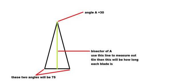 bien no creo que te puedo ayudar mucho en la construcción de suyo que el hecho de que mi diseño se puede cambiar en tamaño y cuchilla cantidad así que voy a dar algunos consejos sobre cómo construirlo, si te quedas atascado en su propio justo deja un comentario y será ayudarle y o publicar una actualización adicional para mostrarte cómo hacer lo que usted tiene una pregunta. bien haciendo diapositivas se puede utilizar una ranura como lo hice o incluso un rodillo de cajón trabajaría para hacer hojas de mover muy bien y hacia atrás. al iniciar su construcción tratan de primera figura hacia fuera cuánto desea la apertura que luego averiguar cuantas hojas quieres permite decir te quiero 12 láminas en el iris que desea hacer el triángulo con un ángulo de 30 grados de ser causan 360 dividido por 12 hojas equivale a 30 ahora usted quiere hacer sus hojas sobre como se abre es amplio así que por ejemplo, usted quiere hacer una apertura de 6 en así que 12 triángulos isósceles con el ángulo extraño que 30 y luego la bisectriz de este ángulo a medir en 6 como en la imagen de abajo.