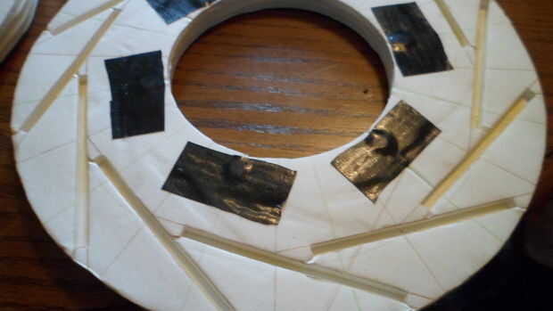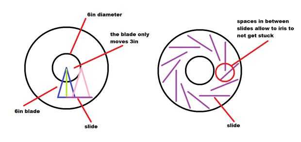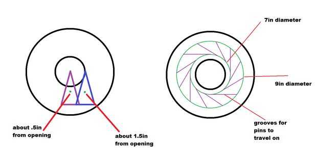 Lo último que estaría haciendo las clavijas de la parte superior de cada hoja que desea poner en la línea bisectriz elegí hacia el centro de la hoja se puede mover hacia arriba o hacia abajo de la línea bisectriz. para hacer las ranuras para ellos que la igual que las diapositivas pero dependiendo de donde poner los pasadores de medir desde el borde de la abertura a su iris para que el pin es cuando tanto abierto y cerrado y parcela a un surco las medidas de la misma. así permite decir su primer pin cuando el diafragma está cerrado medida .5in de la abertura o 3,5 del centro de la abertura que tome esto y épocas por 2 para obtener un diámetro de 7 se puede dibujar hacia fuera de un círculo con este diámetro ahora hacer lo mismo para cuando sea abierto el iris nos se permite decir en 1,5 de la abertura o en 4,5 del hallazgo del centro su diámetro multiplicando por 2 otra vez llegar en 9 que esta es la distancia donde el perno de parada tan dibuje hacia fuera de este círculo también ahora puede dibujar fácilmente hacia fuera de las ranuras para tus pins por sorteo a 12 líneas de 30 grados de uno a porque tenemos 12 hojas.