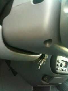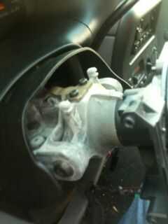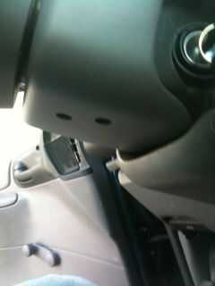 Mi volante tiene una cubierta de plástico de dos piezas con tres tornillos.  Los tornillos son en la parte inferior.  Alguien había estado trabajando con la mía porque faltaba uno de los tornillos.