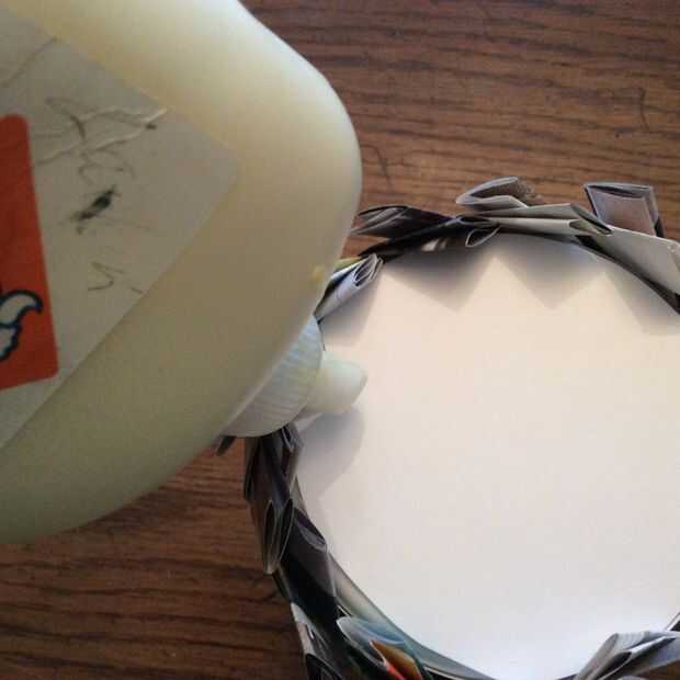 Cuando todas las tiras son tejidas en, uno de los círculos de papel puesto en la parte inferior de la botella. Aplicar una cantidad generosa de pegamento artesanal.
