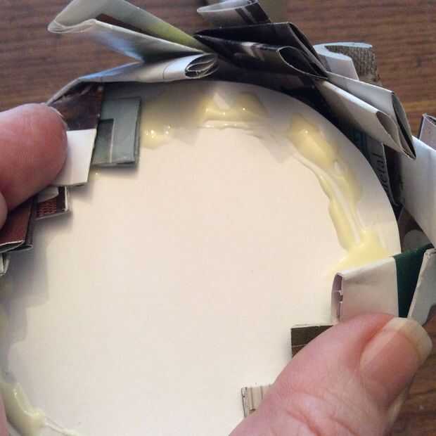 Doblar la tira termina en el fondo, agregar mas pegamento según sea necesario.