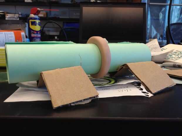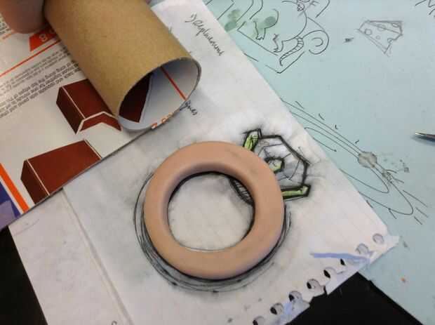 Cueza al horno la forma en el horno durante 30 minutos a 275 grados Fahrenheit. Consulte el embalaje de la arcilla para las marcas que no sean de Sculpey. Utilicé un trozo de cartulina enrollada y algunos soportes de cartón para el anillo redondo en el horno. Terminé estirando un poco, sin embargo.