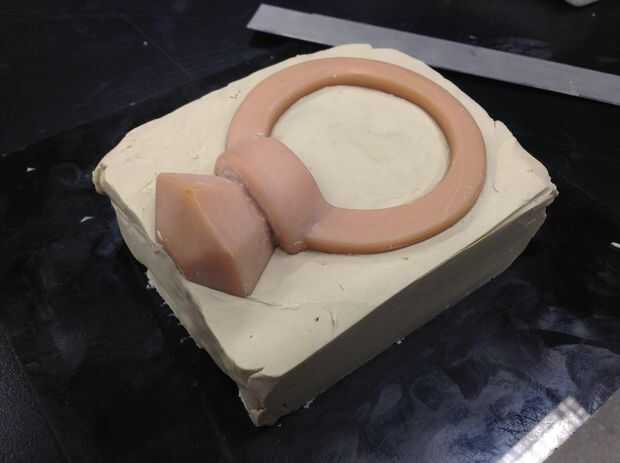 Forma de la arcilla en forma de cuadrado, con al menos 1/4" de espacio alrededor de los bordes de la pieza. La superficie superior del diamante puede dejarse expuesto, ya que es donde lo viertes en el agua más tarde.