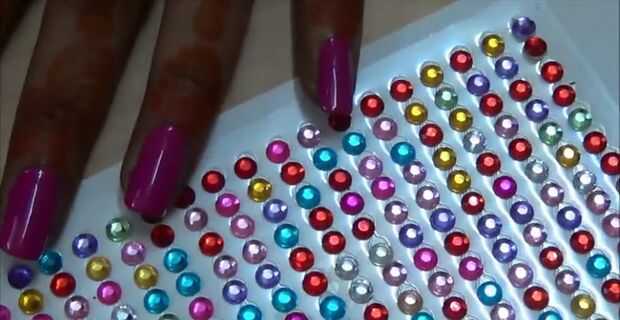 Elegir los diamantes según el color de pintura de uñas. Recuerde que no debe ser del mismo color que la pintura de uñas o no se verá bien. Aquí estoy selección de plata del diamante que brillará en el color rosa.