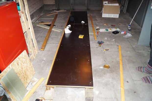 Perforaciones en distancias de 30-40 cm en la madera contrachapada con bisel en los bordes de 5 cm de los bordes. Colocar las vigas de madera paralelos entre sí en el piso. Si ponen la madera en las vigas, puede asegurarse de que las fronteras de la madera contrachapada coinciden con los lados de las vigas. Ahora, atornillar la madera a las vigas en los orificios taladrados. Utilice los tornillos largos.