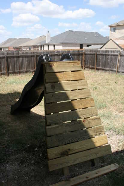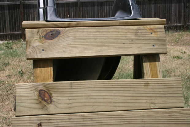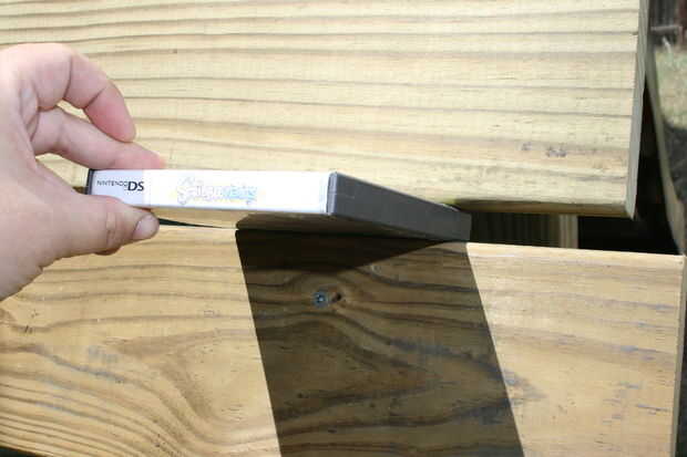 usé una caja de Nintendo DS como un espaciador.  Sólo pasó a ser la perfecta 1/2 que necesitaba.  Use cuatro tornillos en 2 en cada tablero.  Esperar para colocar la última tabla hasta que se ha unido a la cuerda. Usted puede tiene que cavar en el suelo un poco en la parte inferior para colocar la última tabla.