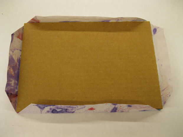 Levante cartón y doblar las esquinas bajo, reemplazar el cartón, luego doblar cada uno de los lados a lo largo de los bordes.