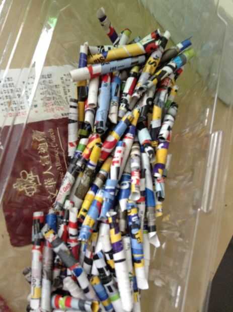 (Lo siento no tengo fotos de esto) básicamente usted cortar el periódico en triángulos largos aproximadamente unos 15 centímetros de altura. Después de usted Enrolle firmemente sobre la espiga y pega el extremo. Repites esto hasta que tengas suficientes granos. Pintando los granos son opcionales.