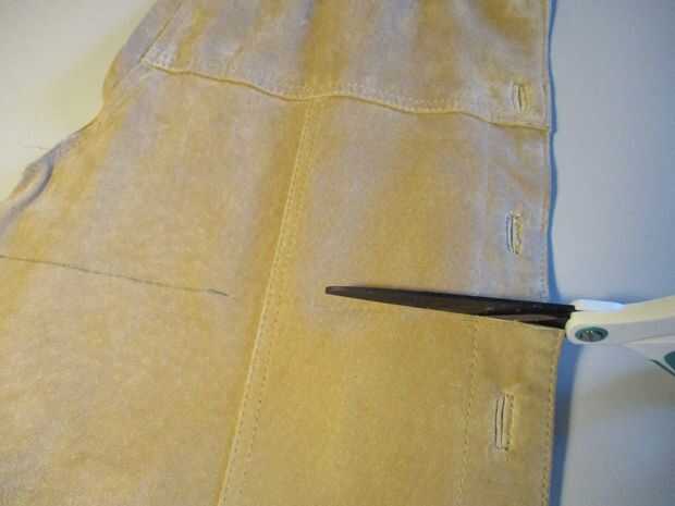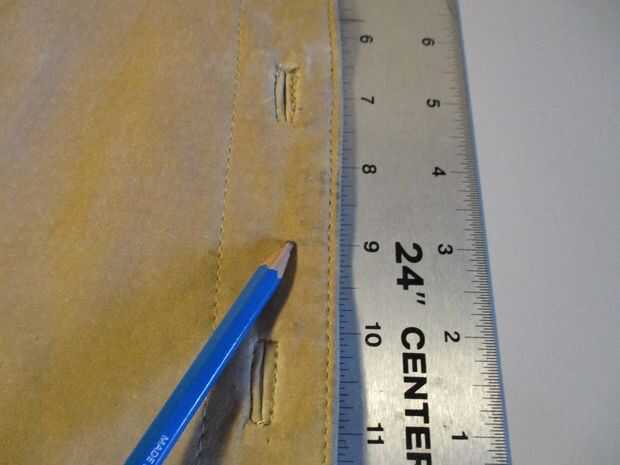 Dibujar una línea exactamente a medio camino entre tres y cuatro ojales y cortar despacio y uniformemente a través de él para dividir el rectángulo en dos.