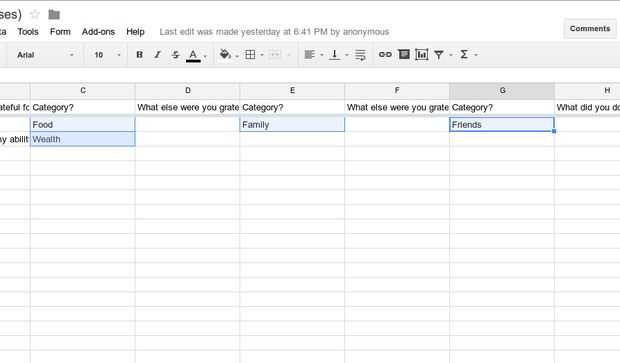 Cuando empecé mi diario de gratitud no tenía ninguna intención de hacer cualquier análisis real de la misma. Para ser honesto, este método no necesita análisis duro. Sin embargo, es posible y podría ser beneficioso. Entiendo cómo hacerlo de una forma de análisis que es algo simple y sencillo. Un día, me gustaría hacer gráficos circulares y gráficos que analizan mi gratitud. Si alguien me puede ayudar con eso, le agradecería. He esbozado mi sencillo método a continuación.
