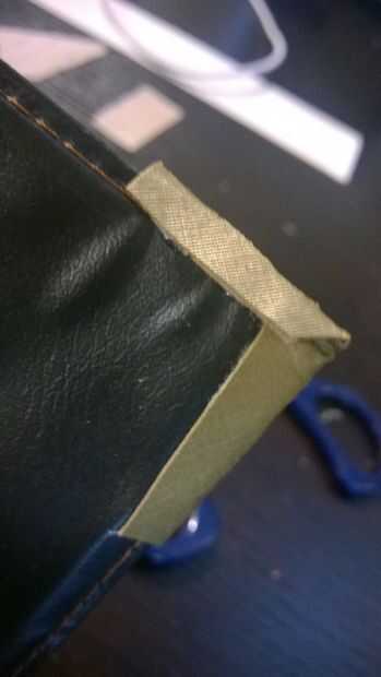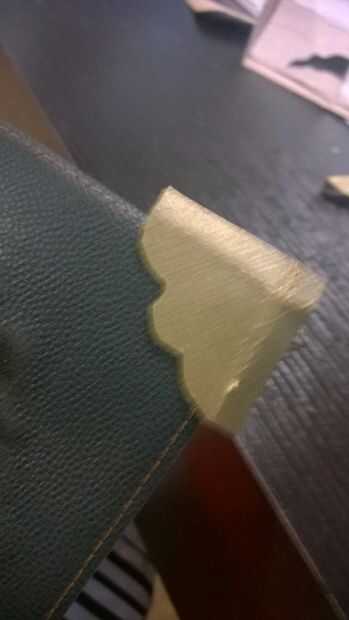 Para las esquinas tenía una caja con una cubierta de oro. Imprimir un patrón de la esquina y 4 de ellos en la cartulina. Después de eso, caliente pegamento cada les en las 2 esquinas en la parte delantera y en la parte posterior. Dibujo con un rotulador negro los diferentes puntos que aparecen en el patrón. Finalmente, usé pintura negra para agregar la erosión en estas esquinas.
