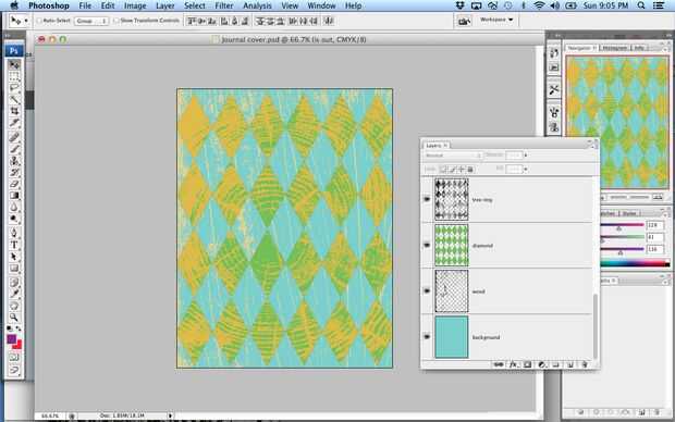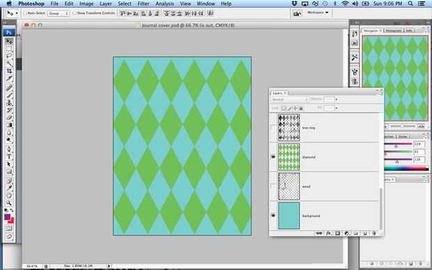 Antes de que usted puede hacer su diario, usted lo necesita portada. Mina había creado en Adobe Photoshop, pero puede utilizar otros programas, seleccionar una imagen para imprimir o simplemente encontrar algún papel bonito. Sin embargo, para recrear el efecto cool en mi portada, crear una capa con una imagen o un color que te gusta. Añadir otra capa por encima de su imagen con una de estas texturas por Kelly Reed del Mercado creativo para agregar profundidad e interés. La variación de color, cambiar tipo de la capa de textura de "normal" a "tono." Decidió crear un patrón de Arlequín con dos capas y había utilizado una textura de madera diferentes en cada capa.