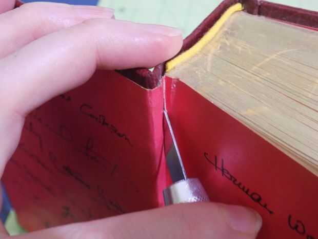 Cortar las páginas del libro por el corte a lo largo de la primera página. Tenga cuidado de no cortar la columna vertebral. Dale la vuelta y cortar la última página.