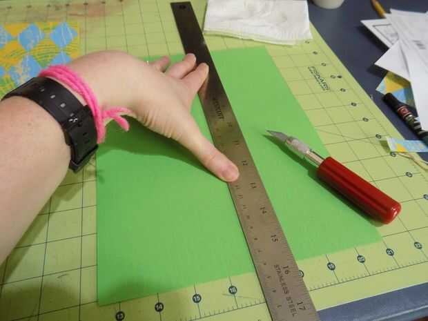 Medida de la columna vertebral. Usted desea cierta superposición, así cortar una tira de papel sobre una media pulgada más gruesa que la columna vertebral expuesta. Use una regla para asegurar un corte recto. He utilizado un trozo de cartulina con textura.