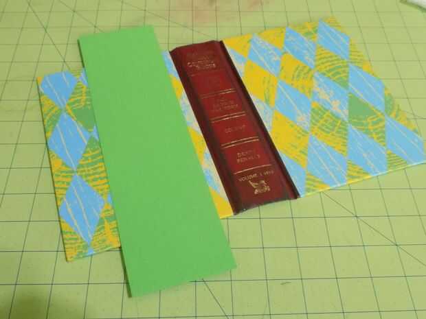 Aplique pegamento en la parte posterior de la tira de papel cortar y presionar sobre el lomo del libro. Utiliza una plegadora para presionar firmemente en los pliegues. Es muy importante para asegurarse de que el libro todavía dobla como debería, así que una vez que has presionado el papel en los pliegues, recoge el libro y ciérrelo. Esto le mostrará cualquier lugar usted perdido o necesita ajustar mientras el pegamento está mojado y el papel es flexible.