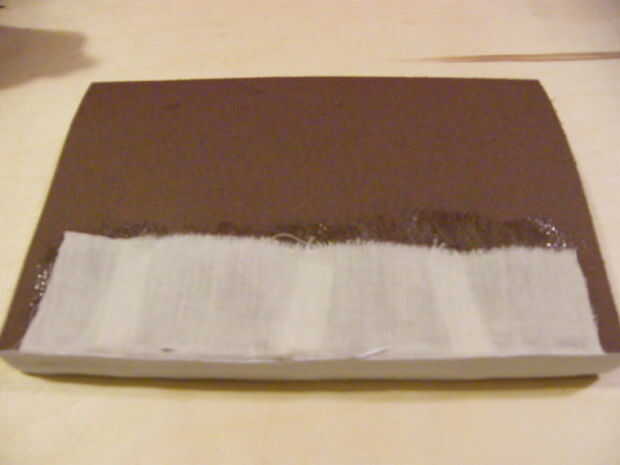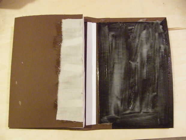 La cinta cruzada al documento final. Luego pegue los bordes extras de la tela sobre la cinta de la tela cruzada. Cubrir el todo fin de papel y tela con pegamento y posición en una de las portadas. Repita en el otro lado.