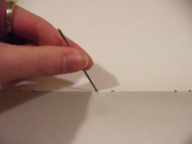 Apilar sus sistemas de papel juntos y marcar donde vas a perforar los agujeros. El tomar su aguja sin hilo y el sacador del agujero donde se marcaron. Ver sus dedos mientras los agujeros de perforación.