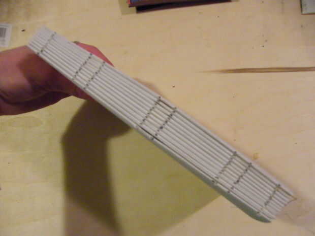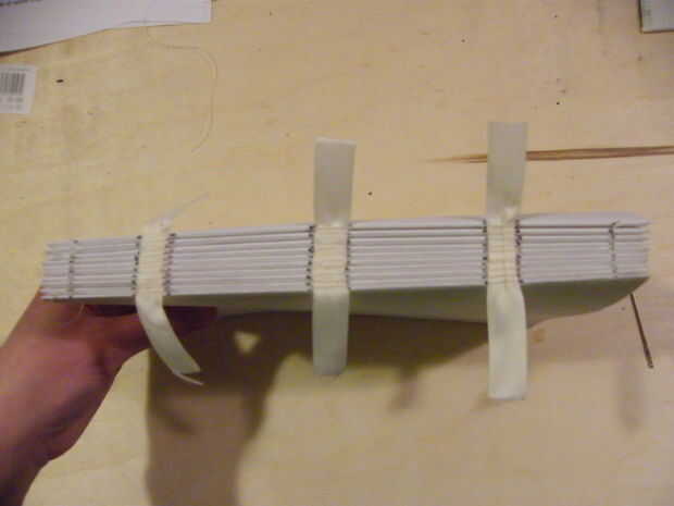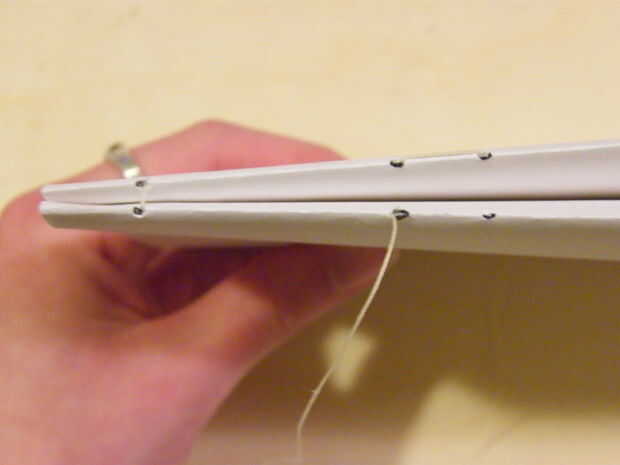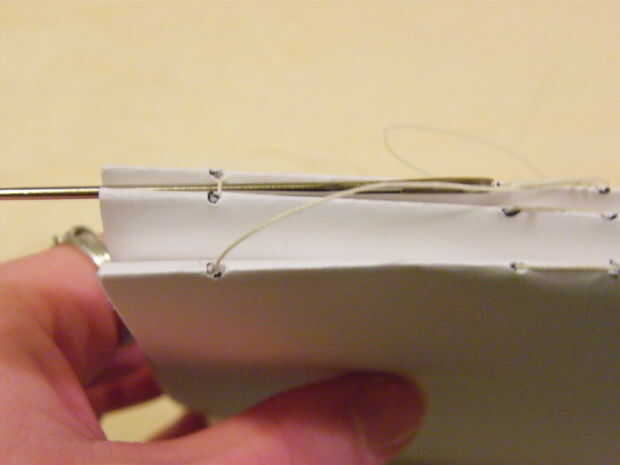 Ahora enhebrar su aguja y coser juntos las páginas. A partir de la primera serie de páginas palo la aguja por el primer agujero y la siguiente. Continuar así hasta el final. Tomar un segundo conjunto de páginas y manténgalo junto a la primera. Palillo de la aguja por el primer agujero del segundo set frente al último agujero de la primera serie. Siga cosiendo arriba y abajo de los agujeros hasta el final. Atar los dos extremos juntos. Añadir el tercer juego al igual que el segundo conjunto. Al llegar al final pase el hilo a través de la rosca de conexión del primer y segundo. Seguir añadiendo juegos hasta que tienes todas ellas cosidas. Si te quedas sin hilo atar otra pieza en y siga cosiendo. Coloque pedazos cortos de la cinta de la tela cruzada en los lazos que creó con el hilo. Tensar el hilo y ate.