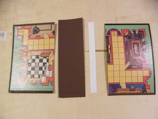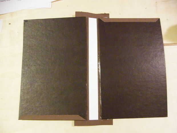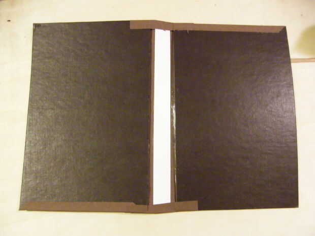 Corte una tira de papel decorativo 3 1/4 de "x 10". Corte una tira de la tarjeta común 3/4 "x 9". Pegue la pieza de tarjeta común centrada en la parte posterior del papel decorativo. Luego pegue las tapas de 1" en el papel decorativo. Debe haber un espacio entre las tapas y la cartulina. A continuación enrollar los extremos del papel decorativo sobre la cubierta y la cartulina.