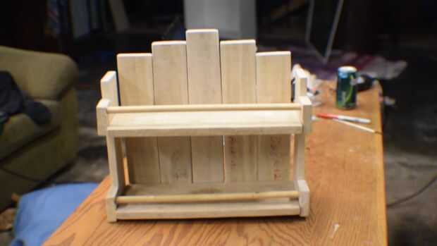 Hice otra vez para el nivel superior y limpiar un poco los bordes con un papel de lija. Iba a utilizar algún pegamento para madera para sujetar las barras en, pero eran bastante atascados y sin duda no va en cualquier lugar en cualquier momento pronto.