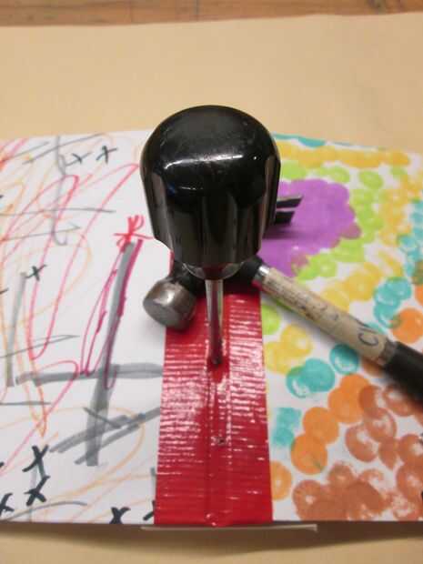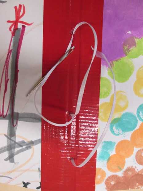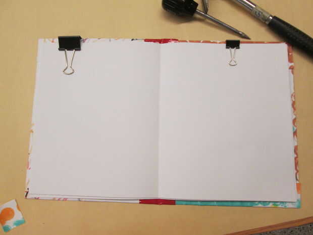 doblar las grandes hojas de papel por la mitad y clip en su lugar dentro de las cubiertas. con martillo y punzón hace 4 agujeros abajo el enlace del libro. Enhebre la aguja con un 12" pieza de la cinta delgada. a partir de la parte exterior Inserte la aguja en el de los agujeros (no tire de ella a través de todo el camino) salen el siguiente hoyo y desenrosque la aguja y atar la cinta en un arco. Luego, termine con los dos agujeros.