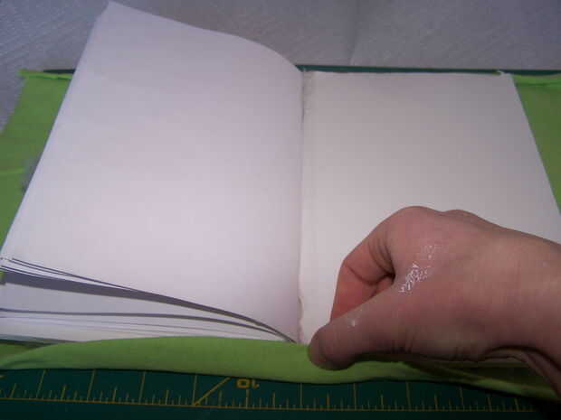 Corte la tela en la parte superior el diario por lo que es aproximadamente 3/4"-1". Poner pegamento en el borde del material y doble encima por lo que es justo al borde de la revista. Luego hacer lo mismo que hicimos antes; poner pegamento en el borde de la revista y doblar el material. Presione hacia abajo en él. Ahora deben cubrir los bordes de su revista.