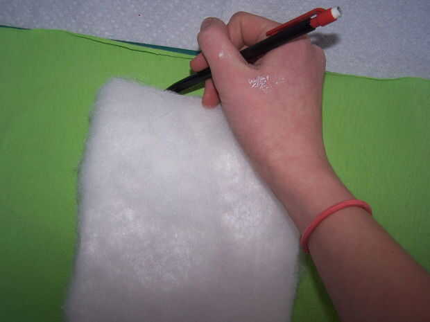Dé vuelta el diario y rociar pegamento caliente sobre el algodón. Rápidamente tire de la tela sobre el algodón y presione firmemente hacia abajo para que se la pega.