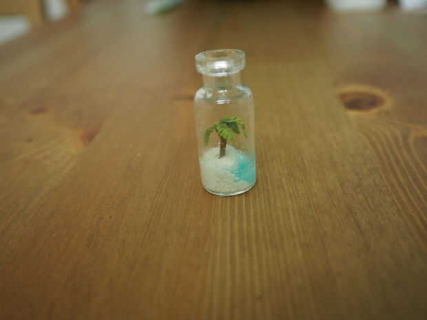 Tomar un poco de arena y de color muy claro y llene aproximadamente una quinta parte de la cubeta con la mezcla de arena de la laca. Hacer una bahía en cerca de un tercio de la superficie con un q-Tip. También hacer un agujero para el árbol de Palma con un palillo de dientes. Luego, deje que se seque completamente.