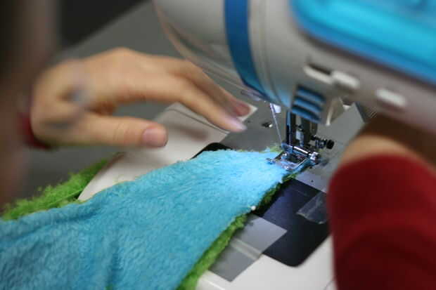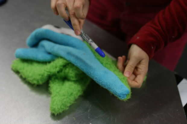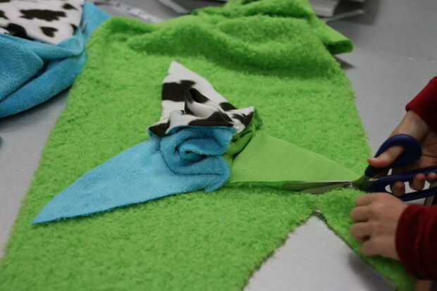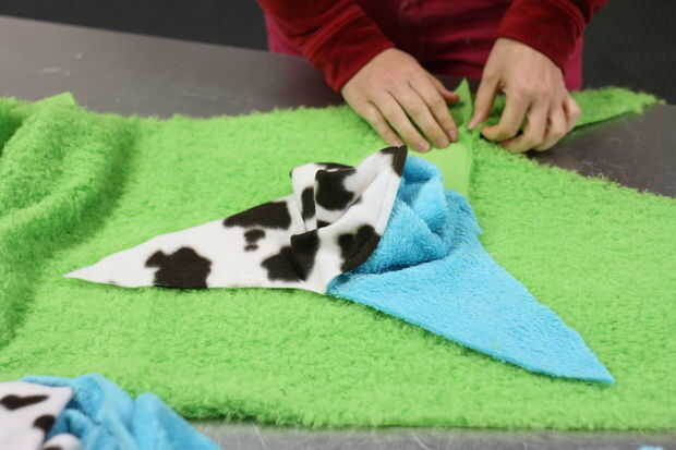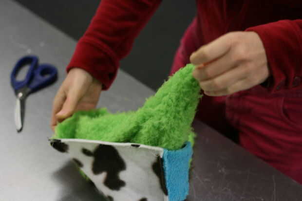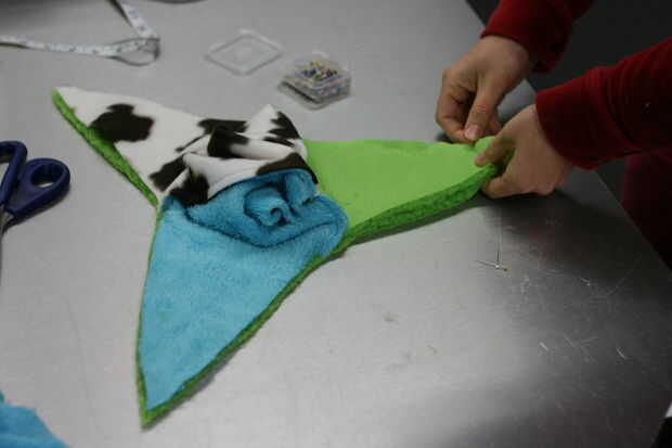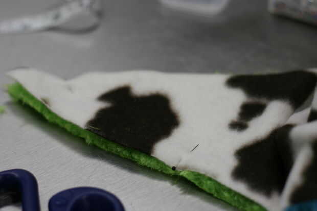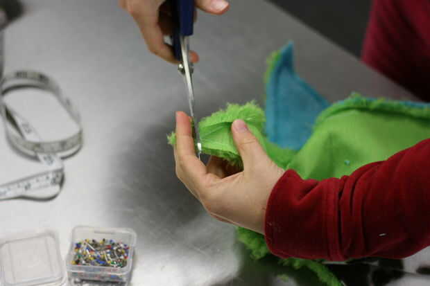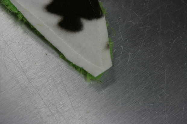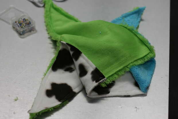 Corte alrededor de los bordes del triángulo así formado. Prender las piezas en unos lugares y coser todo el camino alrededor de los bordes. Cortar los puntos para reducir el bulto (tenga cuidado de no cortar la costura). Gire a la derecha del sombrero hacia fuera (una pluma obtiene los puntos muy bien).