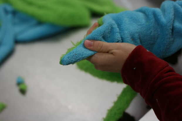 Now it's time to fill in the hole at the top. Poner boca abajo la 'corona' en una de las piezas restantes. (Por supuesto usted podría utilizar a un cuarto tejido en este punto también!) Se extienden los puntos mienten suavemente sin arrugas, habrá arrugas en los lados del sombrero, pero eso está bien.